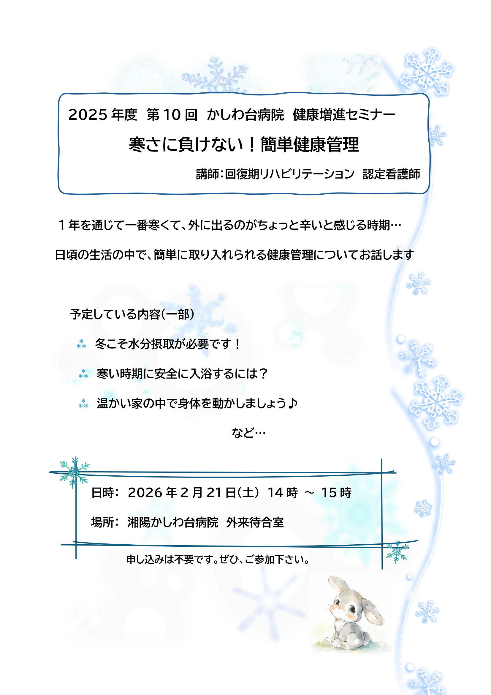 次回のセミナーは看護師より「寒さに負けない簡単健康管理」というテーマでお話をさせていただきます。