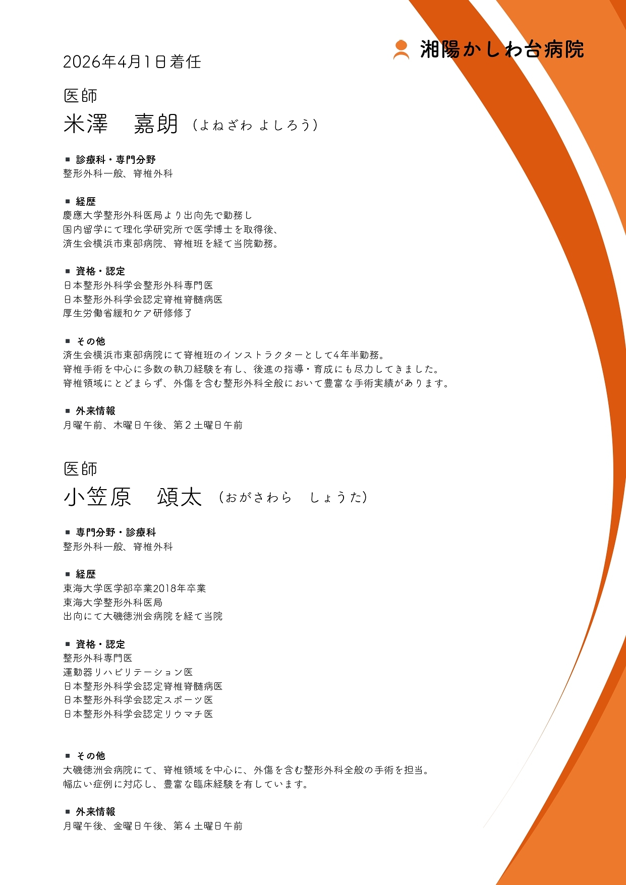 このたび当院では、整形外科診療体制のさらなる強化を目的として、脊椎外科を専門とする医師が新たに着任いたします。