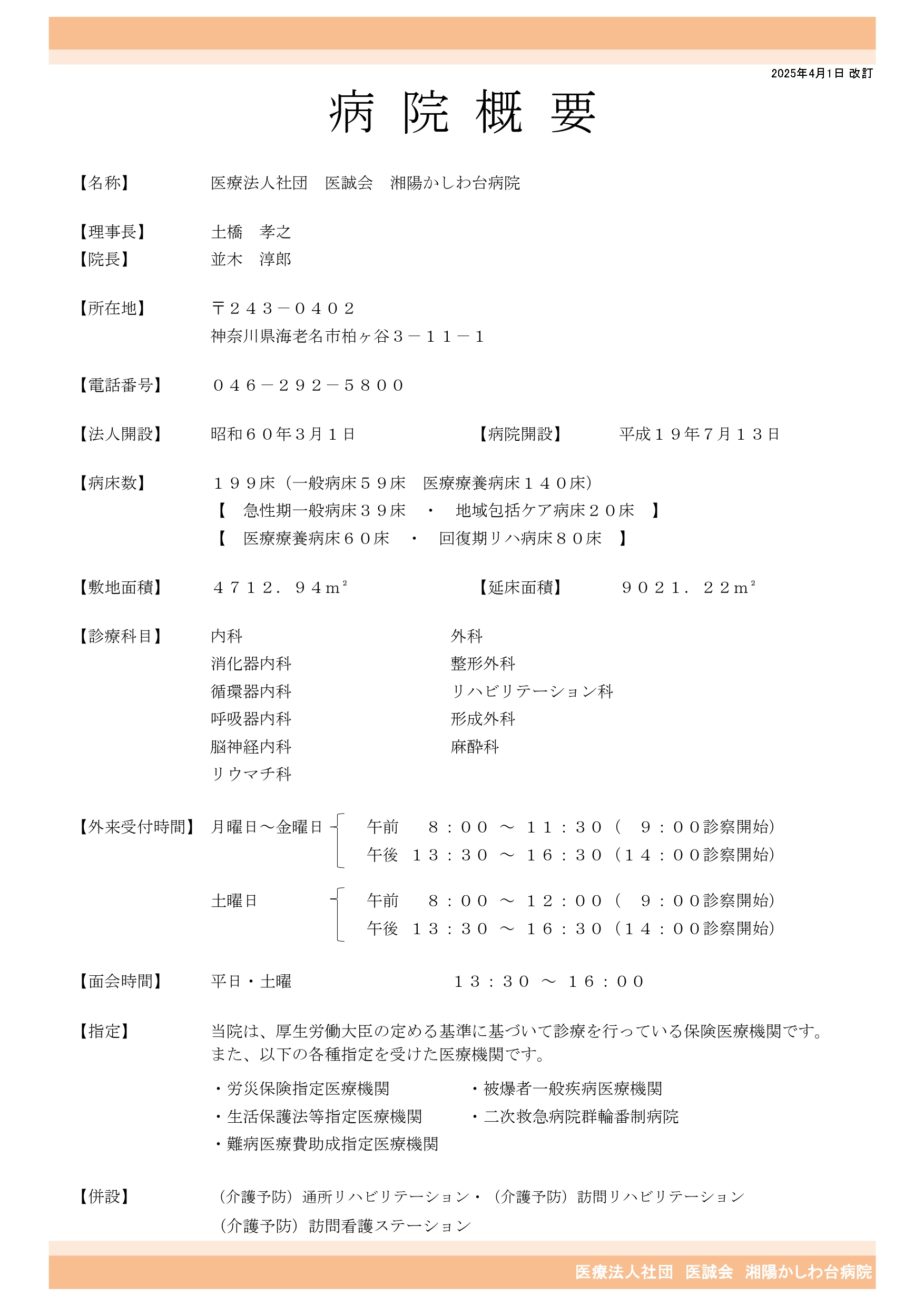 | 病床数 | 199床一般急性期病床39床、地域包括ケア病床20床医療療養病床60床、回復期リハビリテーション病棟80床 |