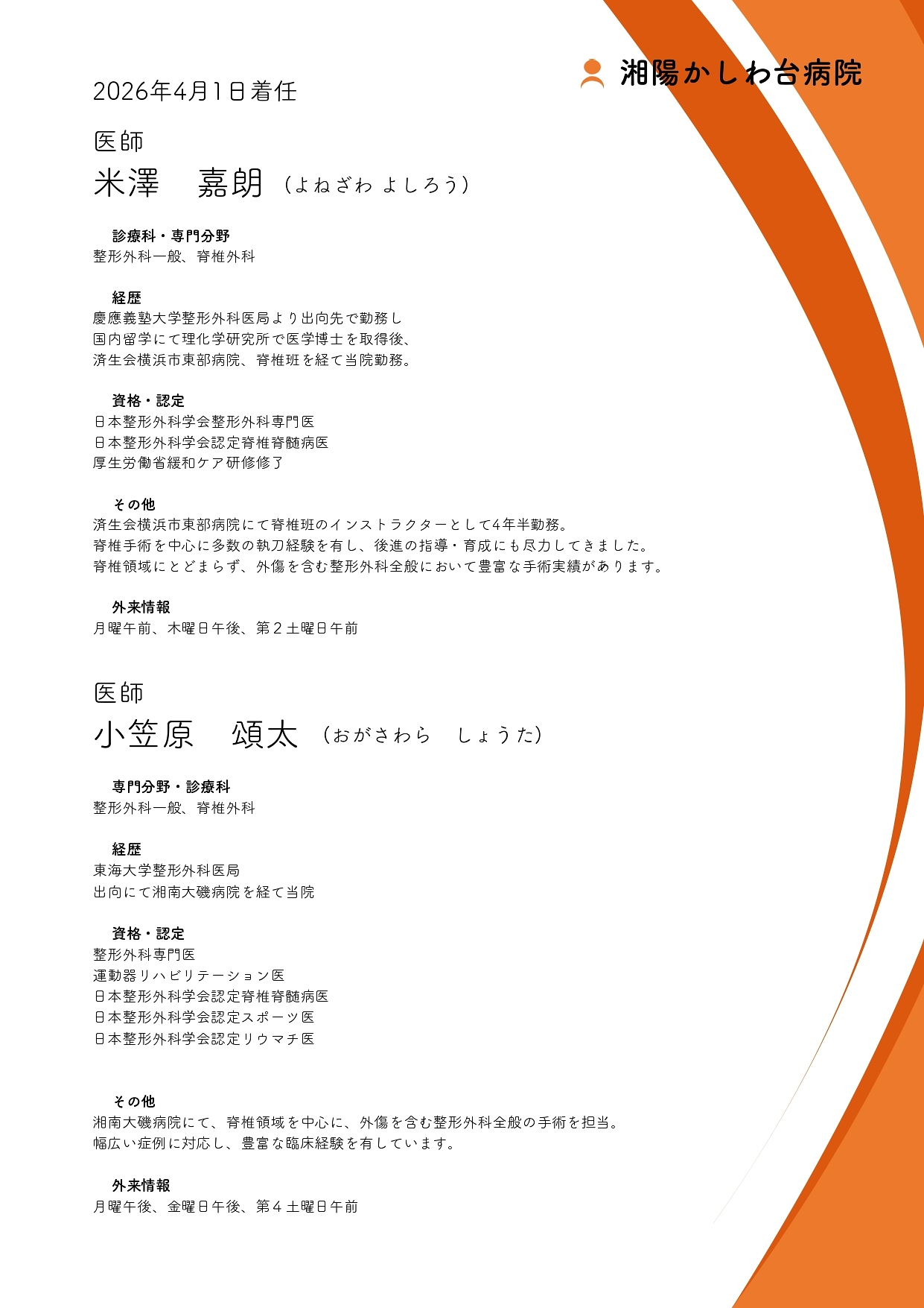 このたび当院では、整形外科診療体制のさらなる強化を目的として、脊椎外科を専門とする医師が新たに着任いたします。